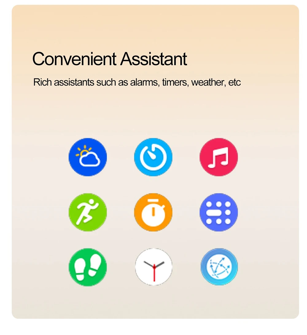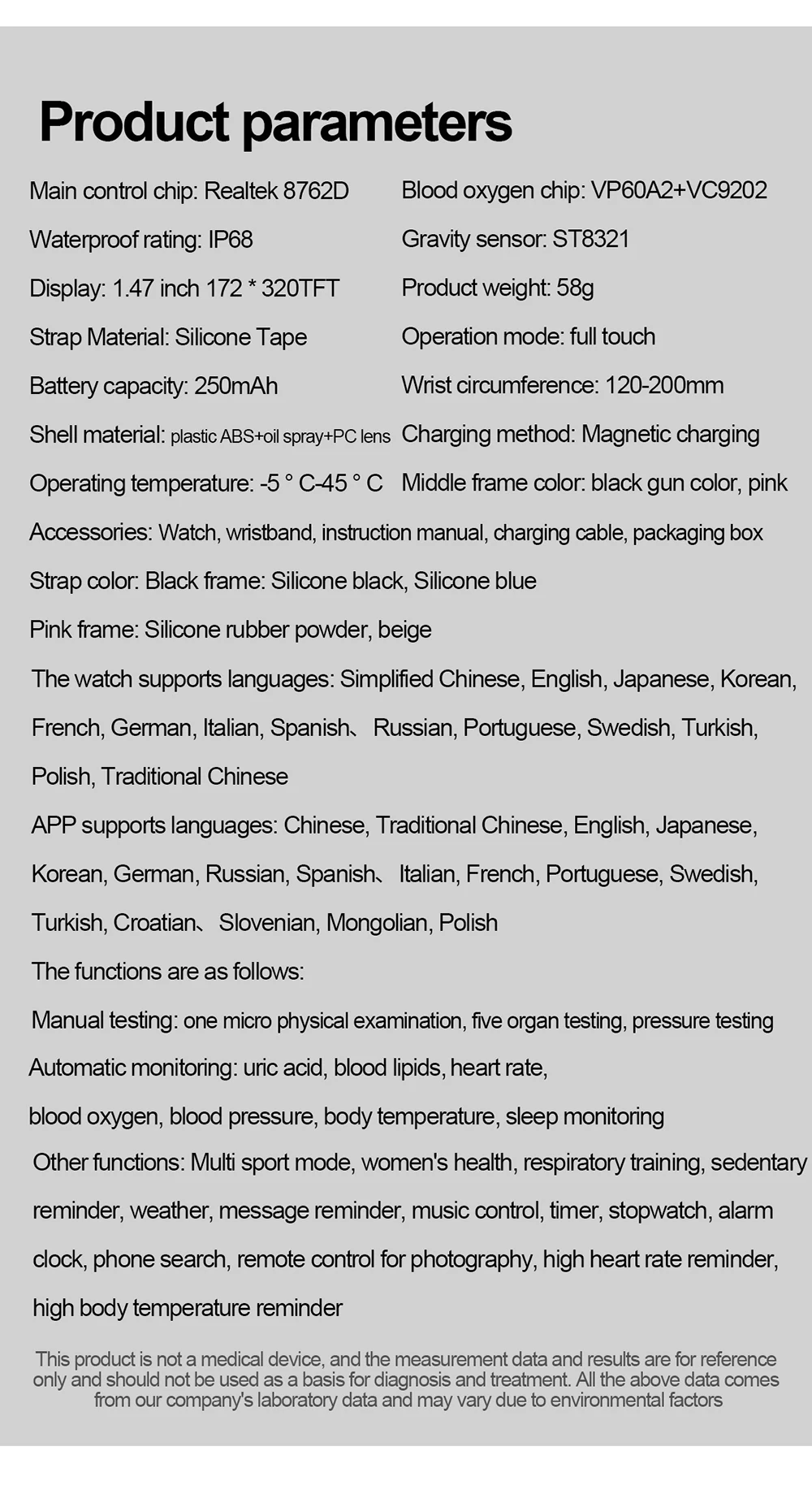 11.Other functions: Women's health, respiratory training, high body temperature reminder, high heart rate reminder, message reminder, stopwatch, countdown, step count, calories, distance, exercise mode, call reminder, alarm reminder, sitting reminder, raising hand to light up screen, social sharing (WeChat, QQ, Facebook, Twitter), shaking camera, music control, drinking water reminder, medication reminder, access to WeChat exercise, Apple Health, etc