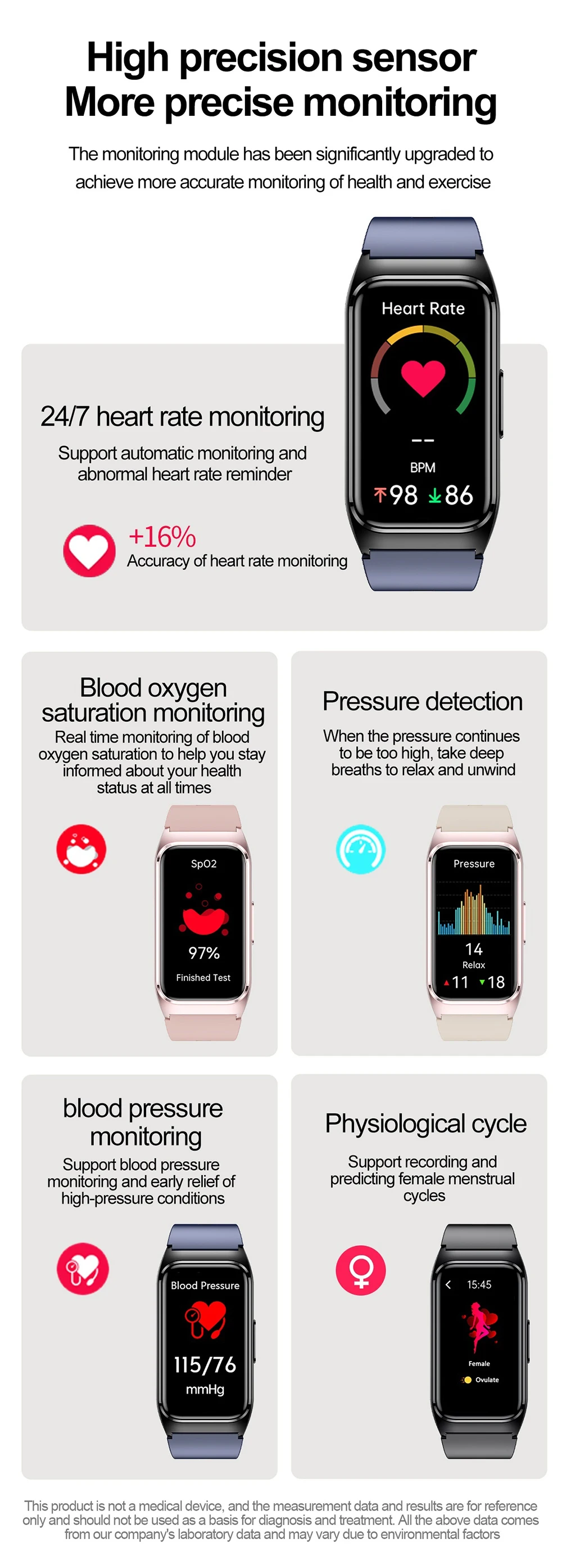 5. 24-hour continuous dynamic heart rate monitoring (with live detection function), temperature monitoring, pressure measurement, independent and accurate blood oxygen, blood pressure monitoring, sleep monitoring
